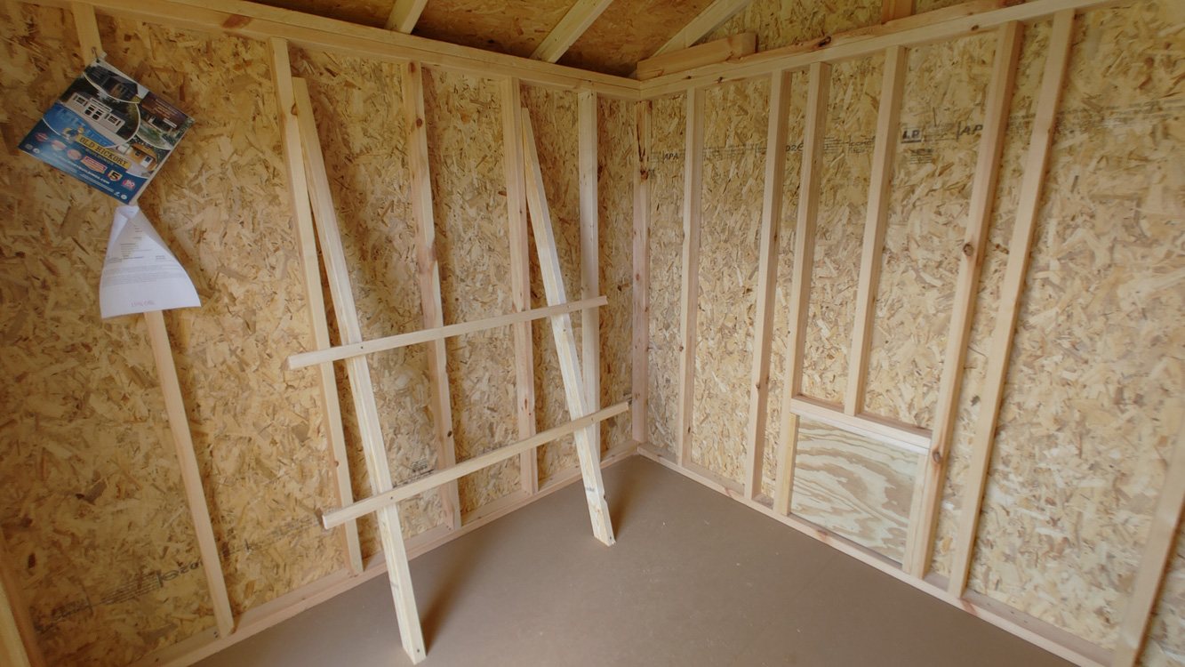 A-frame utility style chicken coop with 6'3" walls, two 24" x 27" windows and a single 36" x 72" single barn door. The shed has the single barn door in the center of the 6' wide (measured eave to eave) side of the building with a hatch on the opposing wall. The chicken coop also features four nesting boxes below two 24' x 27" windows. The siding is LP Smart Panel zinc borate treated siding and has a 50 year warranty through the siding manufacturer. The building is built with 16" on center studs, 24" on center trusses, double top stud plate, 2" x 4" floor joists, 4" x 6" pressure treated skids, which are notched for 16" on center floor joists, which are also pressure treated. The floor is painted 5/8" tongue and groove engineered panels. Standard floor options are designed for 40 lb/sq. ft. live load and 200 lb/sq. ft. point load. This building comes with 29 gauge silver metal roof, which has a 30 year limited warranty. The building is finished with Sherwin Williams' Rustic Red paint and Barn White trim. The barn door comes with a set of two matching keys. Additional options are available on custom ordered buildings. Engineer certified for 30 psf ground snow load and 105 mph winds. Built by Old Hickory Buildings in Virginia.
