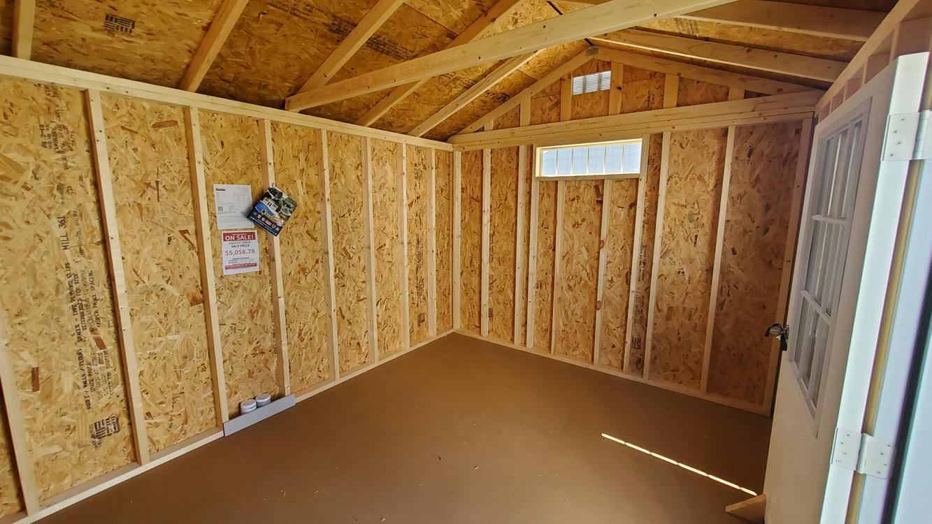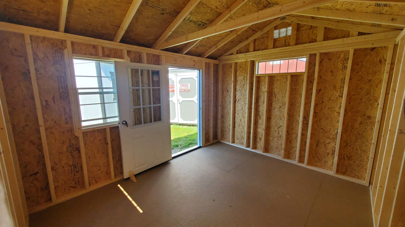 A-frame utility style storage shed with 7' walls, one 2' x 3' single pane window, two 10" x 35" horizontal windows and a 9-lite house style door. The shed has the short house style door on the 12' side of the building with the window to the right, and one transom style 10" x 35" on each gable end wall. The siding is Pewter Cast LP dutch lap siding, with vapor barrier. The building is built with 16" on center studs, 24" on center trusses, double top stud plate, 2" x 4" floor joists, 4" x 6" pressure treated skids, which are notched for 16" on center floor joists, which are also pressure treated. The floor is painted 5/8" tongue and groove engineered panels. Standard floor options are designed for 40 lb/sq. ft. live load and 200 lb/sq. ft. point load. This building comes with black shingle roof, which has a 30 year limited warranty. The building is finished with Pewter Cast paint on the siding and barn white trim. The door comes with a set of two matching keys. Additional options are available on custom ordered buildings. Built by Old Hickory Buildings in Virginia.