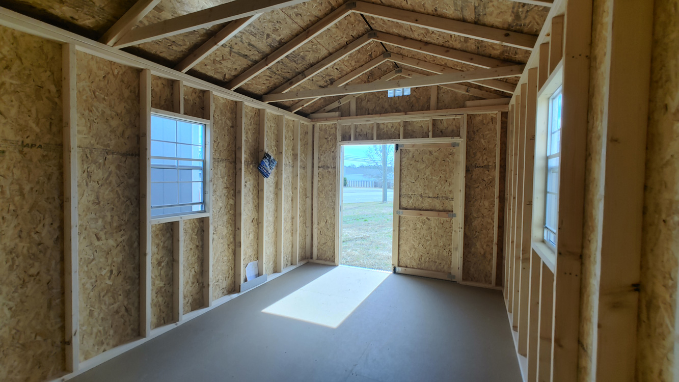 A-frame utility style storage shed with double barn doors, two 2' x 3' windows and 8' walls. The siding is LP Smart Panel zinc borate treated siding and has a 50 year warranty through the siding manufacturer. The building is built with 16" on center studs, 24" on center trusses, 2" x 4" floor joists, double top stud plate, 4" x 6" ground rated pressure treated skids, which are notched for 16" on center floor joists, which are also pressure treated. The floor is painted 5/8" tongue and groove engineered panels. Standard floor options are designed for 40 lb/sq. ft. live load and 200 lb/sq. ft. point load. This utility shed comes with 29 gauge silver metal roof, which has a 30 year limited warranty. The building is finished with Sherwin Williams' Eaglet Beige paint and Barn White trim. The double barn doors comes with a set of two matching keys. Additional options are available on custom ordered buildings. Built by Old Hickory Buildings in Virginia.