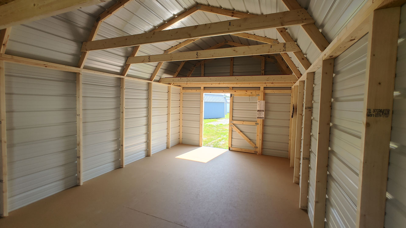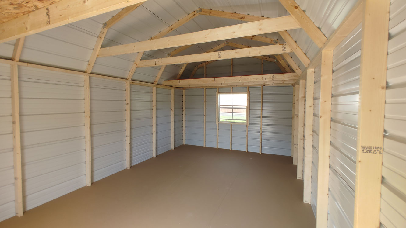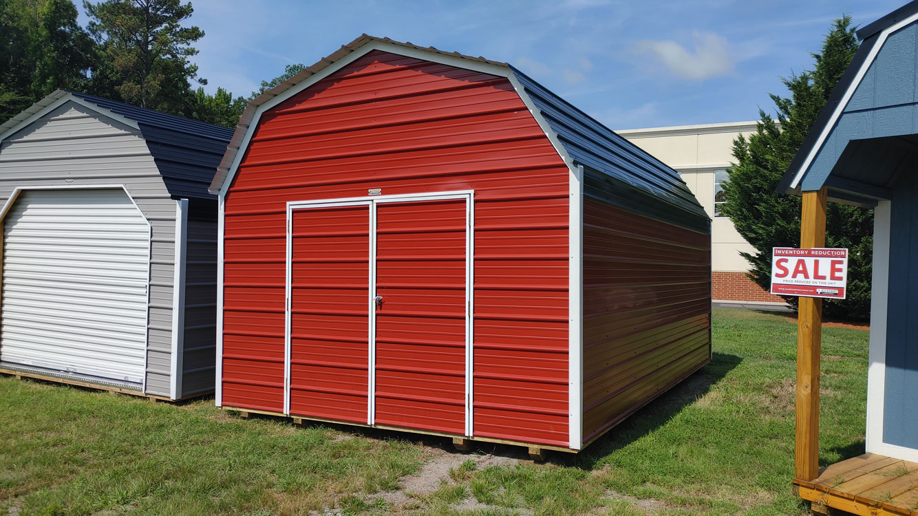Lofted barn style storage shed with 6'7" walls. The shed has the double doors in the center of the 12' wide side of the building with 4' loft storage in the front and back of the building. The siding is 29 gauge Brite Red steel and has a 30 year warranty through the metal manufacturer. The building is built with 36" on center studs, 36" on center trusses, 2" x 4" floor joists, 4" x 6" pressure treated skids, which are notched for 12" on center floor joists, which are also pressure treated. The floor is painted 5/8" engineered panels. Standard floor options are designed for 40 lb/sq. ft. live load and 200 lb/sq. ft. point load. This building comes with 29 gauge black metal roof, which has a 30 year limited warranty. The building is finished with brilliant white trim. The double barn doors comes with a set of two matching keys. Additional options are available on custom ordered buildings. Built by Old Hickory Buildings in Virginia.