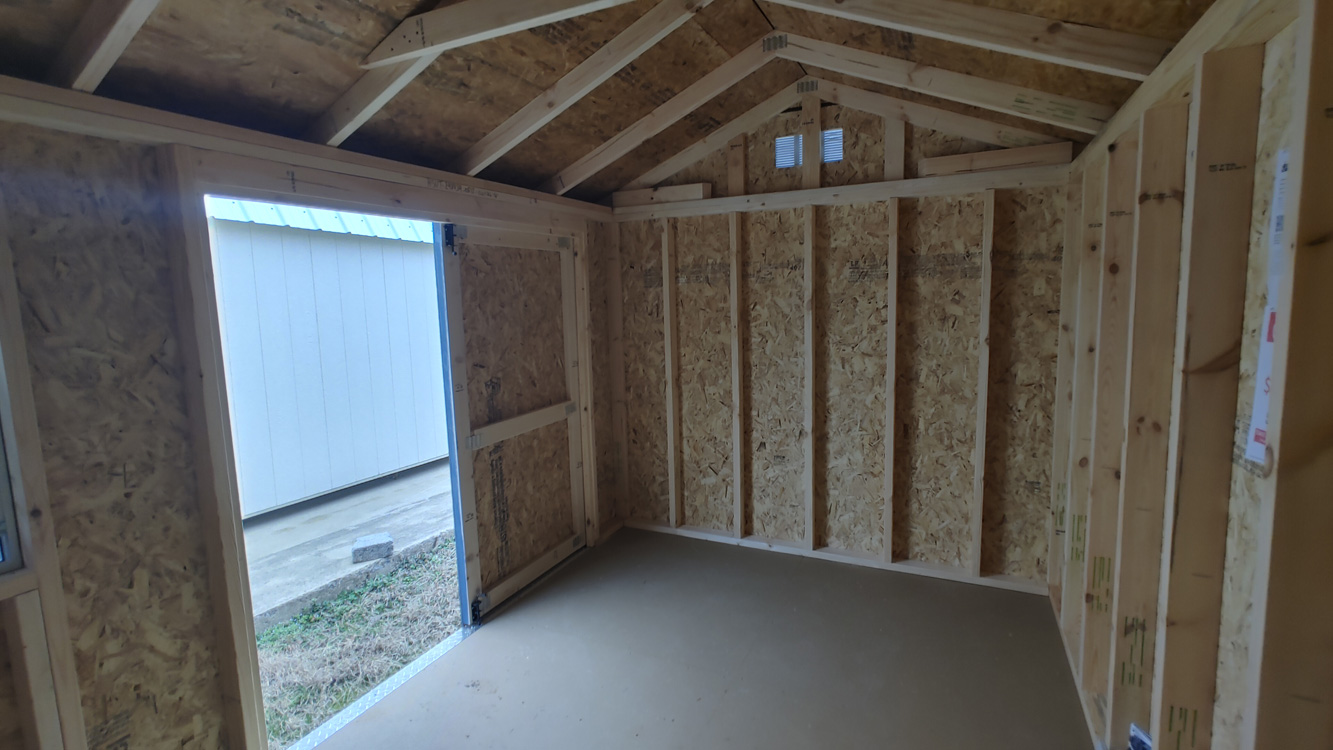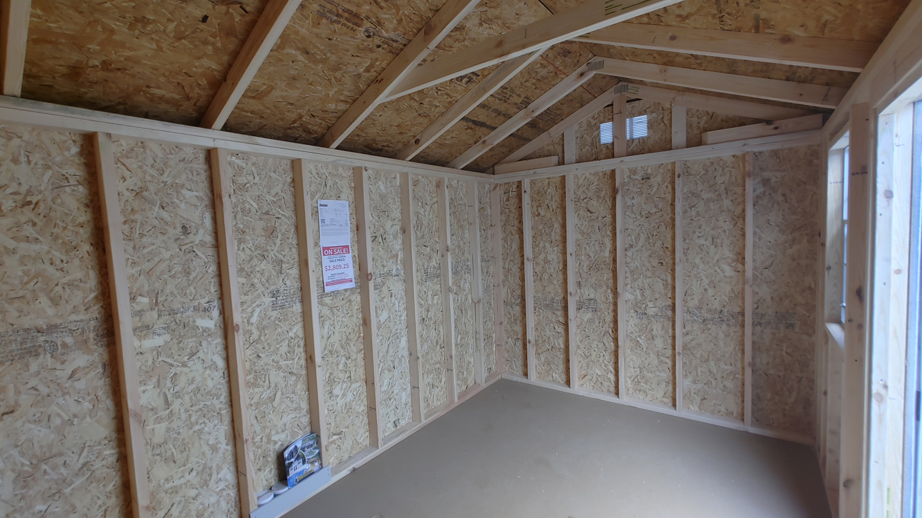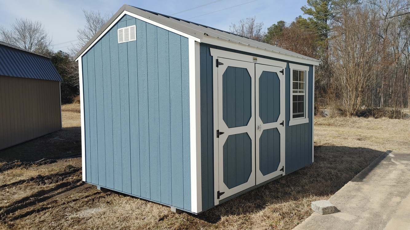 A-frame utility style storage shed with 6'3" walls, one 2' x 3' black frame window and double barn door. The shed has the double barn door on the left of the 12' wide side of the building, with the window to the right of the door. The siding is LP Smart Panel zinc borate treated siding and has a 50 year warranty through the siding manufacturer. The building is built with 16" on center studs, 24" on center trusses, double top stud plate, 2" x 4" floor joists, 4" x 6" pressure treated skids, which are notched for 16" on center floor joists, which are also pressure treated. The floor is painted 5/8" tongue and groove engineered panels. Standard floor options are designed for 40 lb/sq. ft. live load and 200 lb/sq. ft. point load. This building comes with 29 gauge black charcoal roof, which has a 30 year limited warranty. The building is finished with Sherwin Williams' Smokey Blue paint and Tricorn Black trim. The barn door comes with a set of two matching keys. Additional options are available on custom ordered buildings. Engineer certified for 30 psf ground snow load and 105 mph winds. Built by Old Hickory Buildings in Virginia.