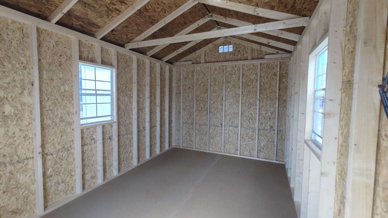 A-frame utility style storage shed with double barn doors, two 2' x 3' windows and 8' walls. The siding is LP Smart Panel zinc borate treated siding and has a 50 year warranty through the siding manufacturer. The building is built with 16" on center studs, 24" on center trusses, 2" x 4" floor joists, double top stud plate, 4" x 6" ground rated pressure treated skids, which are notched for 16" on center floor joists, which are also pressure treated. The floor is painted 5/8" tongue and groove engineered panels. Standard floor options are designed for 40 lb/sq. ft. live load and 200 lb/sq. ft. point load. This utility shed comes with 29 gauge silver metal roof, which has a 30 year limited warranty. The building is finished with Sherwin Williams' Eaglet Beige paint and Barn White trim. The double barn doors comes with a set of two matching keys. Additional options are available on custom ordered buildings. Built by Old Hickory Buildings in Virginia.