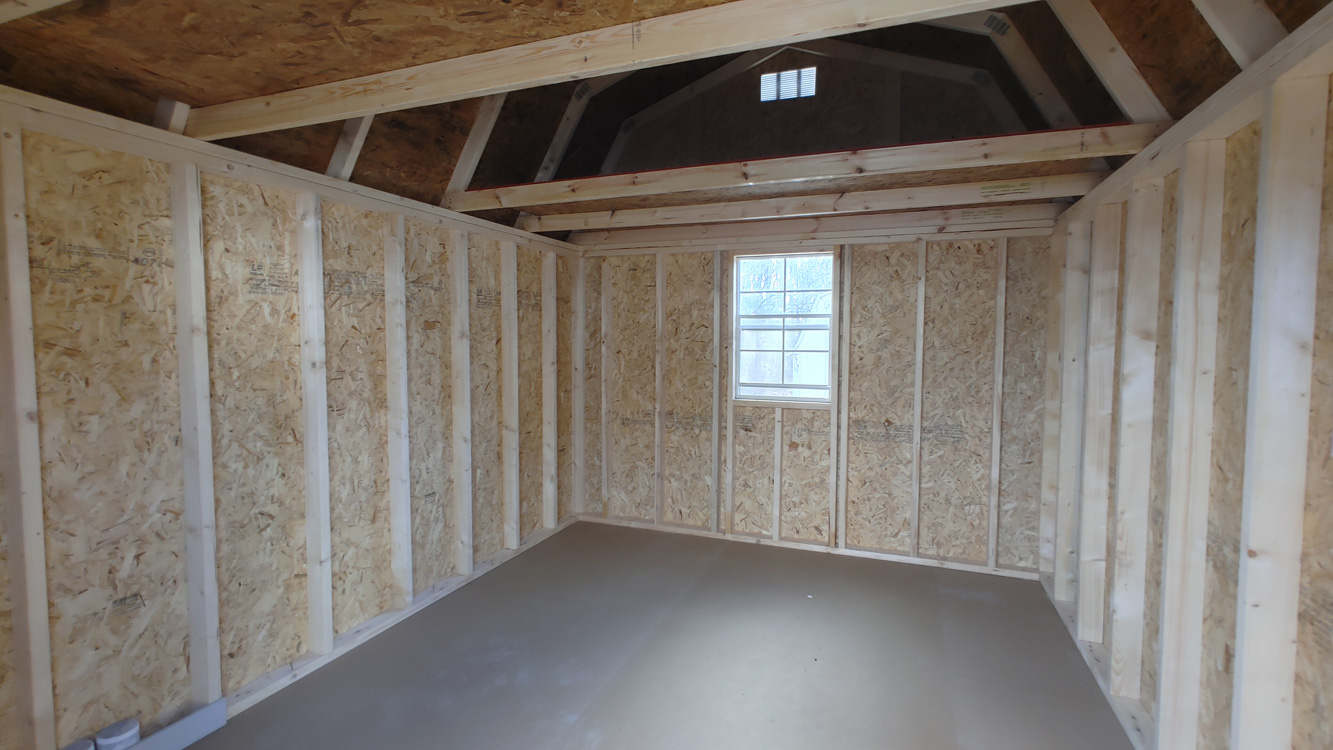 Lofted barn style storage shed with 6'3" walls, one 2' x 3' window, and double barn doors. The shed has double barn doors in the center of the 10' wide side of the building, with 4' loft storage in both the front and back of the building. The siding is LP Smart Panel zinc borate treated siding and has a 50 year warranty through the siding manufacturer. The building is built with 16" on center studs, 24" on center trusses, double top stud plate, 2" x 4" floor joists, 4" x 6" pressure treated skids, which are notched for 16" on center floor joists, which are also pressure treated. The floor is painted 5/8" tongue and groove engineered panels. Standard floor options are designed for 40 lb/sq. ft. live load and 200 lb/sq. ft. point load. This building comes with 29 gauge black metal roof, which has a 30 year limited warranty. The building is finished with Sherwin Williams' Barn White paint and Tricorn Black trim. The double barn doors comes with a set of two matching keys. Additional options are available on custom ordered buildings. Built by Old Hickory Buildings in Virginia.
