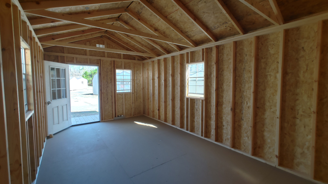 A-frame utility style storage shed with 8' walls, and a playhouse package (4ft. porch, three 2' x 3' windows, and a 36" right hand inswing, 9 lite house style door) with a vaulted gable and features an additional 6" front and back overhang for added style and weather protection. The siding is LP Smart Panel zinc borate treated siding and has a 50 year warranty through the siding manufacturer. The building is built with 16" on center studs, 24" on center trusses, 2" x 6" floor joists, 4" x 6" pressure treated skids, which are notched for 16" on center floor joists, which are also pressure treated. The floor is painted 5/8" tongue and groove engineered panels. Standard floor options are designed for 40 lb/sq. ft. live load and 200 lb/sq. ft. point load. This building comes with 29 gauge hunter green metal roof, which has a 30 year limited warranty. The building is finished with Sherwin Williams' Peppercorn Gray paint and barn white trim. The walk in door comes with a set of two matching keys. Additional options are available on custom ordered buildings. Built by Old Hickory Buildings in Virginia.